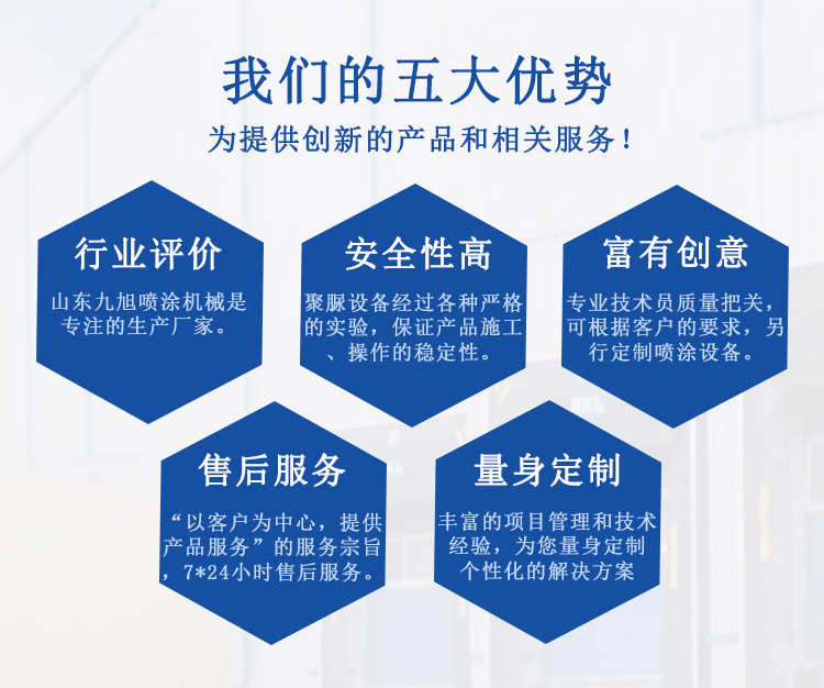 目前山東九旭機(jī)械設(shè)備已領(lǐng)跑中國(guó)液壓聚脲設(shè)備行業(yè),價(jià)格合理成為廣大客戶之首選。液壓聚脲噴涂機(jī)廠家所銷售產(chǎn)品主要來(lái)自國(guó)內(nèi)及國(guó)際知名品牌,產(chǎn)品性能優(yōu)良,價(jià)格合理,專業(yè)的技術(shù)和完善的售后服務(wù)贏得國(guó)內(nèi)外眾多客戶的誠(chéng)摯贊賞........